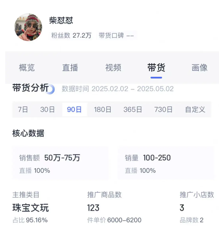 据大象新闻,在胖东来事件之前,柴怼怼并不是一个被大众广泛认识的博主。在短视频平台仅拥有20余万粉丝的柴怼怼属于玉石赛道的博主,记者通过第三方数据平台查询发现,近90天内柴怼怼直播带货销售额为50万元~75万元之间,场均销售额在5万元~7.5万元左右。带货商品中新疆和田玉手镯,单价为19800元。