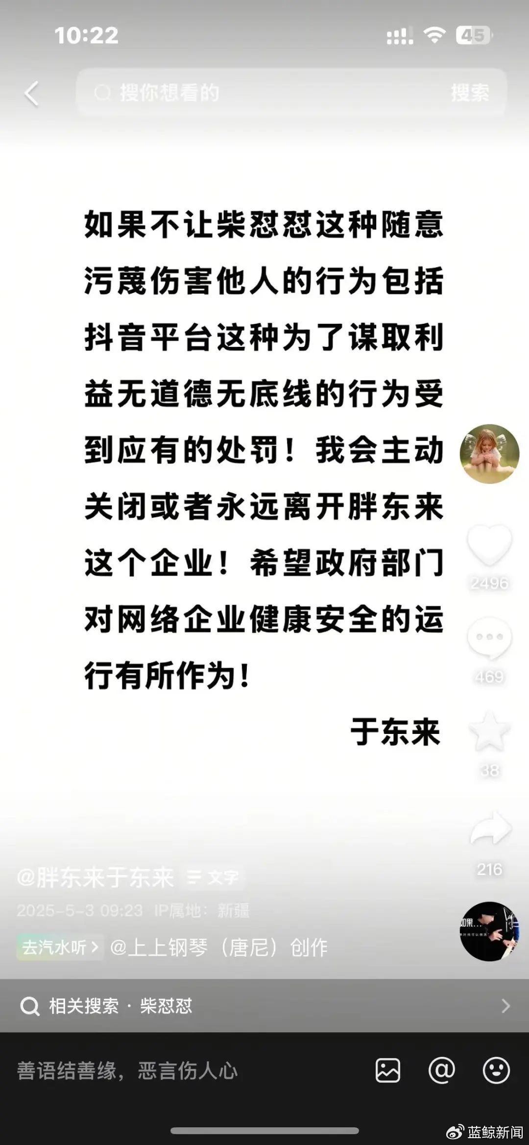 据蓝鲸新闻,五一假期,于东来在社交媒体连续发布多条推文,对近期柴怼怼风波的再度回应。其中,5月3日上午更是直接发文称,如果不让柴怼怼这种随意污蔑伤害他人的行为受到应有的处罚,“我会主动关闭或永远离开胖东来这个企业!”