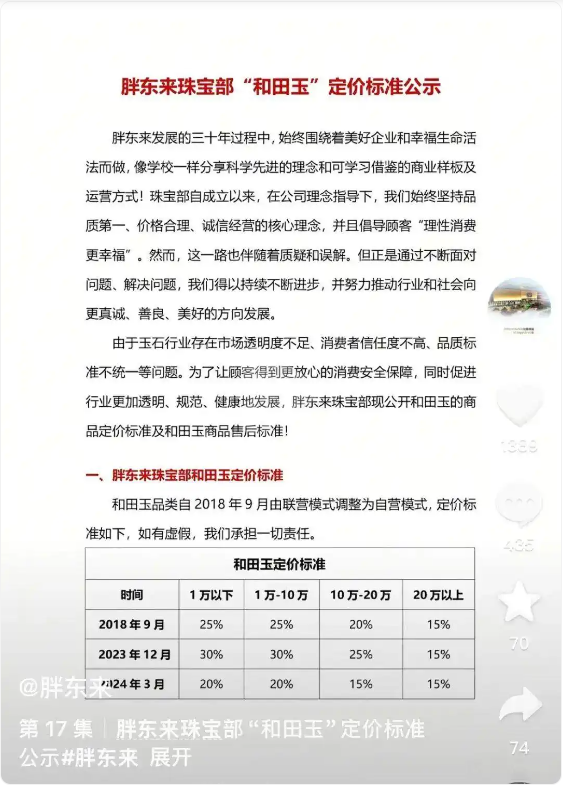 据悉,胖东来钻石、宝石、翡翠、和田玉、珍珠等珠宝产品毛利率按价格划分为两档,10万元以上毛利率为15%,10万元以下毛利率为20%,珠宝部商品综合毛利率为15%~16%。